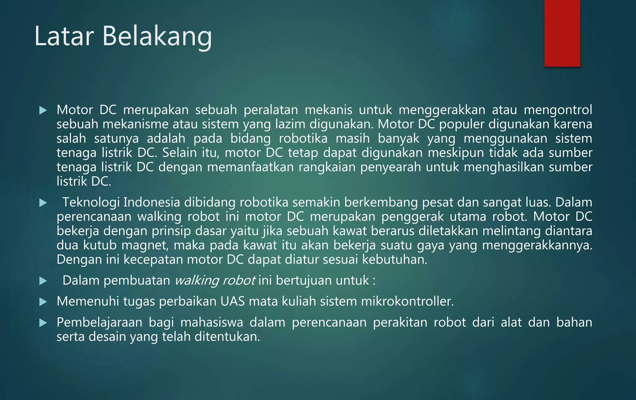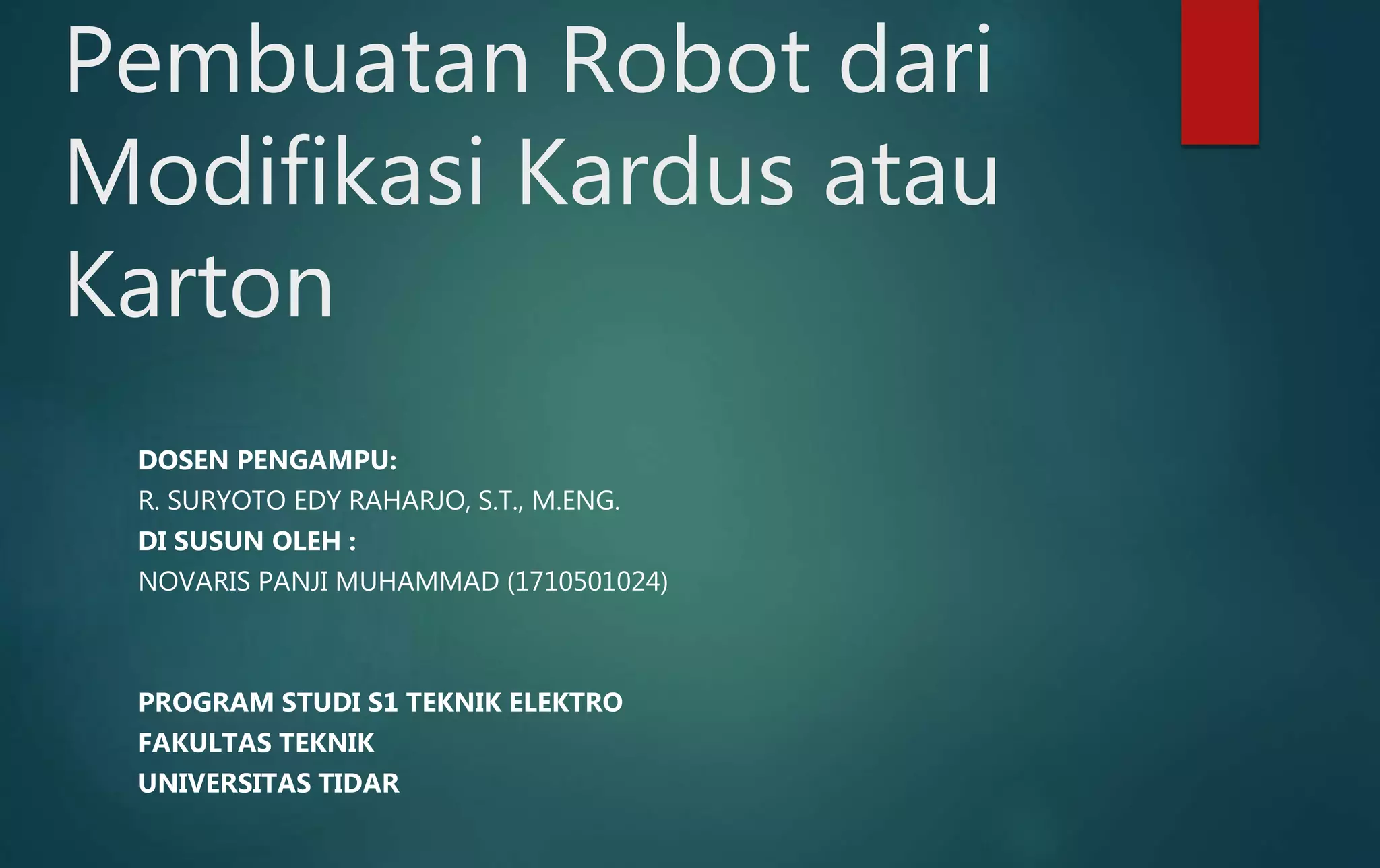 (1) Dokumen tersebut membahas tentang pembuatan robot dari modifikasi kardus atau karton menggunakan motor DC dan mikrokontroler;
