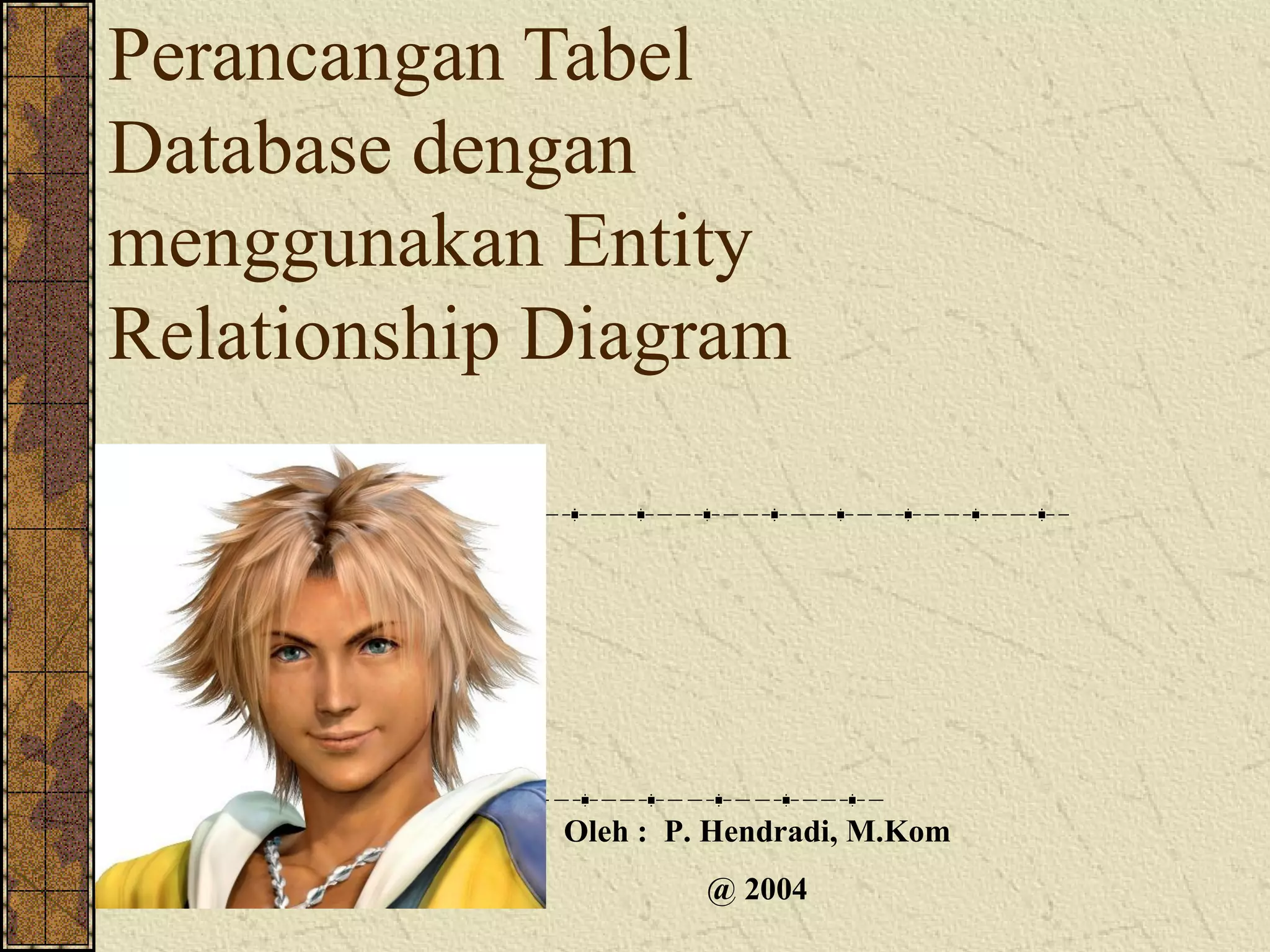 Dokumen ini membahas perancangan tabel database menggunakan Entity Relationship Diagram, termasuk konsep dasar database, pengelolaan data, dan berbagai jenis kunci dalam database. Terdapat juga contoh kasus mengenai struktur tabel dan hubungan antar entity dalam sistem basis data. Selain itu, dokumen ini mencakup metode dekomposisi tabel dan partisipasi hubungan dalam representasi tabel.
