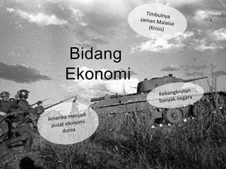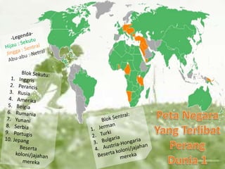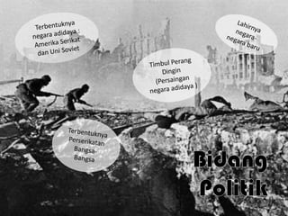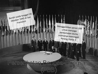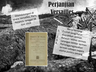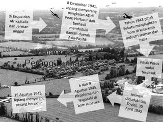Dokumen ini membahas Perang Dunia I dan II, termasuk penyebab, jalannya perang, dan dampaknya. Perang Dunia I dimulai pada 28 Juli 1914 dan berakhir pada 11 November 1918, menghasilkan perjanjian Versailles yang merugikan Jerman. Perang Dunia II dipicu oleh kegagalan Liga Bangsa-Bangsa dan konflik yang lebih luas di Eropa, dimulai dengan invasi Jerman ke Polandia pada 1 September 1939.