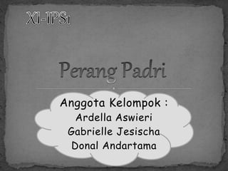 Perang Padri terjadi di Sumatera Barat pada abad ke-19 antara kaum Padri melawan kaum adat akibat perbedaan pendapat dalam ajaran agama Islam. Perang ini kemudian melibatkan Belanda yang ingin menguasai wilayah tersebut. Perang berlangsung selama beberapa dekade dan berakhir dengan penangkapan dan pembuangan Tuanku Imam Bonjol, pemimpin kaum Padri terakhir, yang menandai berakhirnya perlawanan terhadap penjajahan