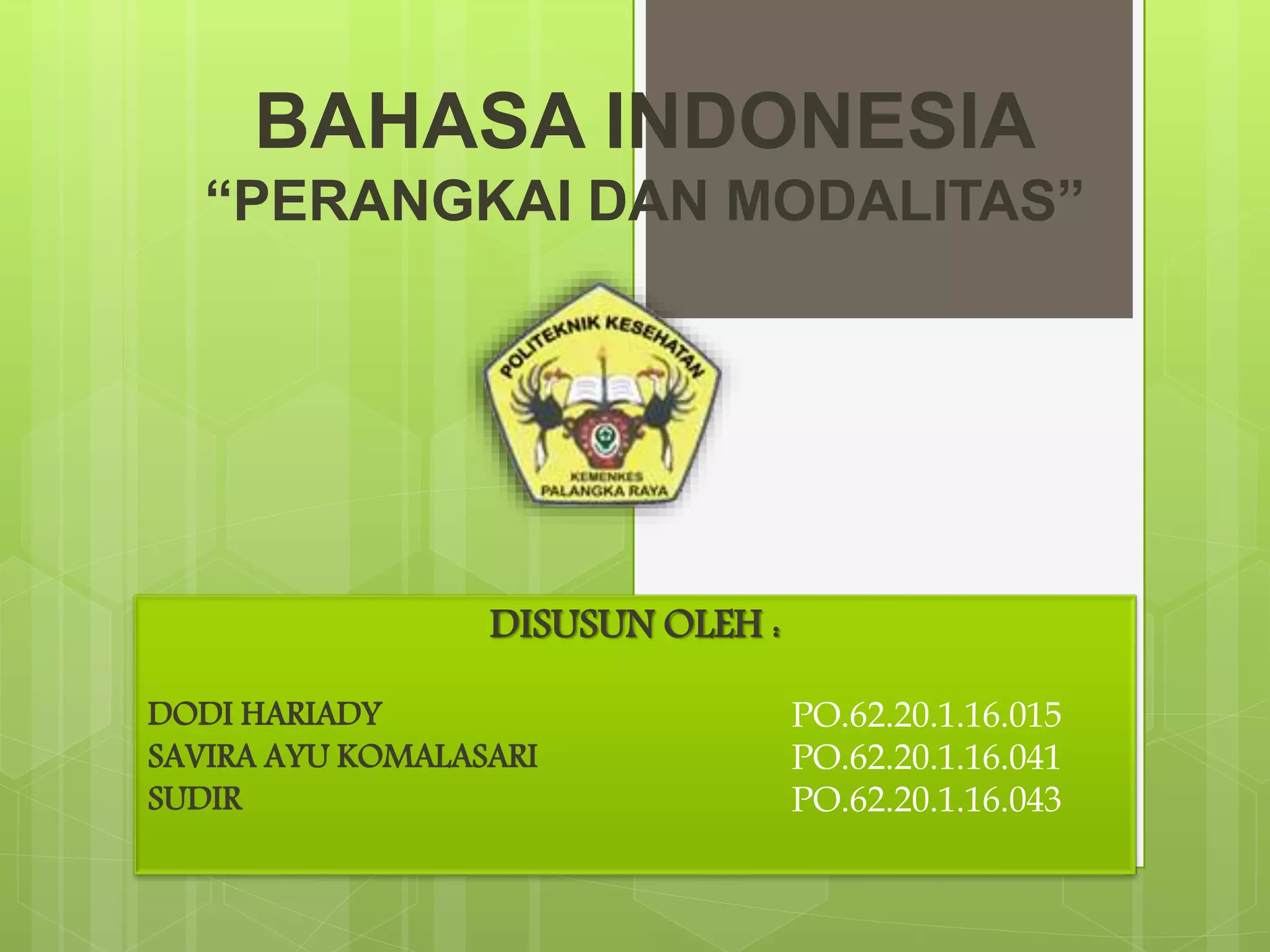 Dokumen ini membahas tentang perangkai dan modalitas dalam bahasa Indonesia. Perangkai berfungsi menghubungkan bagian-bagian kalimat atau paragraf, sementara modalitas menyatakan sikap pembicara terkait topik yang dibicarakan. Terdapat beberapa jenis modalitas, yaitu intensional, epistemik, deontik, dinamik, dan aletis.