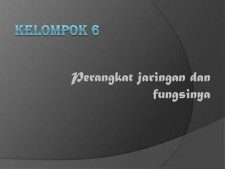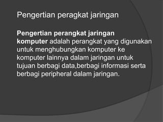 Dokumen ini menjelaskan perangkat jaringan komputer yang menghubungkan komputer dalam jaringan untuk berbagi data. Contoh perangkat yang dijelaskan meliputi NIC, kabel jaringan, konektor, hub, switch, router, modem, bridge, dan repeater. Masing-masing perangkat memiliki fungsinya sendiri dalam membangun dan mengelola jaringan dengan efisiensi.