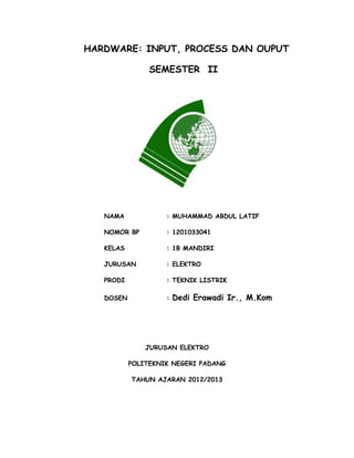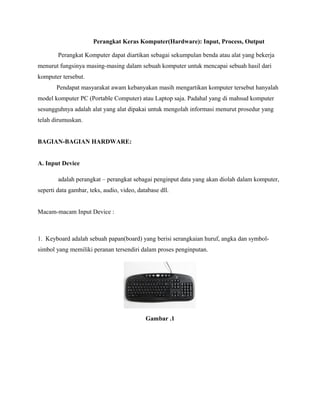 Dokumen ini membahas tentang perangkat keras komputer (hardware), yang terdiri dari perangkat input, proses, dan output. Penjelasan mencakup berbagai jenis perangkat input seperti keyboard dan scanner, serta komponen pemroses dan output seperti CPU dan monitor. Selain itu, dijelaskan juga fungsi dari berbagai komponen dalam komputer, termasuk chipset, soket, dan konektor.