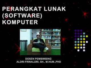 Dokumen ini membahas tentang perangkat lunak komputer, yang mencakup sistem operasi, program aplikasi, bahasa pemrograman, dan program bantu sistem. Itu juga menjelaskan berbagai jenis perangkat lunak seperti pengolah kata, spreadsheet, dan alat desain, serta utility yang meningkatkan kinerja sistem operasi. Contoh bahasa pemrograman yang disebutkan termasuk bahasa tingkat rendah, tingkat tinggi, dan generasi keempat.