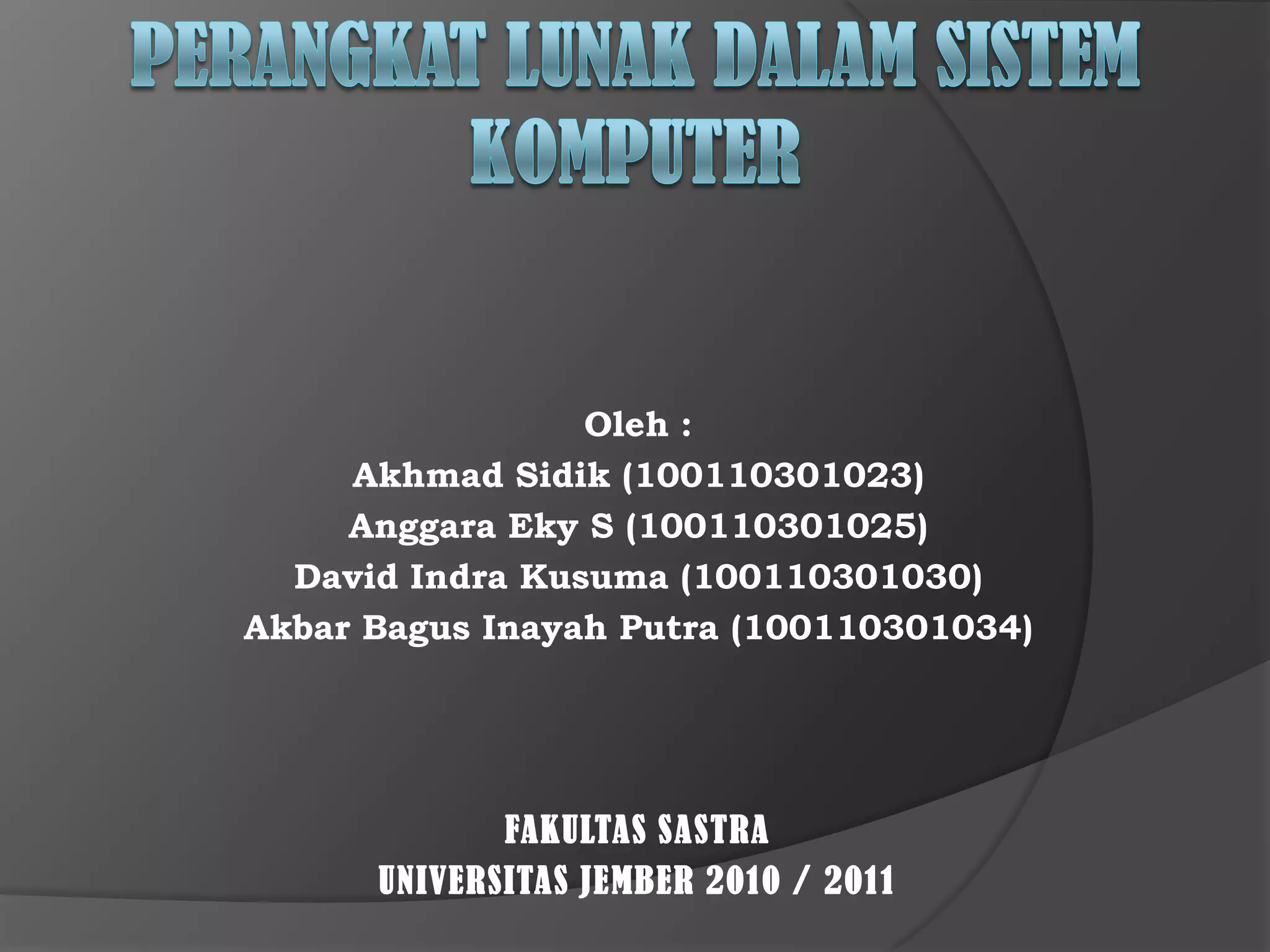 Dokumen ini menjelaskan pengertian dan fungsi perangkat lunak (software) dalam sistem komputer, yang berperan sebagai penghubung antara pengguna dan perangkat keras. Terdapat berbagai jenis perangkat lunak, termasuk aplikasi, sistem operasi, freeware, shareware, malware, bahasa pemrograman, dan program bantu. Contoh-contoh perangkat lunak dan kategori-kategorinya juga diberikan untuk memperjelas konsep yang dibahas.