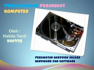 Dokumen tersebut memberikan informasi tentang perawatan harddisk secara hardware dan software untuk menjaga kinerja dan umur harddisk. Secara hardware, perawatan mencakup membersihkan debu, menambahkan kipas pendingin, menjaga ventilasi dan suhu. Secara software, perawatan meliputi mengosongkan ruang di harddisk, mengatur konfigurasi tidur, membuat partisi, mengecek kondisi secara berkala, dan menginstal utilitas pemeliharaan.