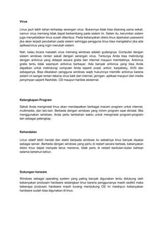 Ada beberapa perbedaan utama antara Linux dan Windows, termasuk biaya (Linux gratis sedangkan Windows mahal), keamanan (Linux lebih aman dari virus sedangkan Windows rentan terhadap virus), dan kelengkapan program standar (Linux hadir dengan berbagai program sedangkan Windows membutuhkan penginstalan program tambahan).