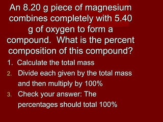 This document provides information and examples for calculating percent composition, empirical formulas, and molecular formulas of compounds. It defines key terms like percent composition and empirical formula. It then works through examples of calculating the percent composition of magnesium and oxygen that form a compound, the percent composition and mass of carbon in propane, and determining empirical formulas from elemental percentages or mole ratios. The document explains how to calculate molecular formulas from empirical formulas and molar masses. Finally, it provides practice problems for the reader to work through.