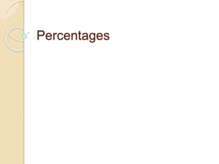 This document discusses percentages and percent problems. It defines a percentage as a fraction with a denominator of 100. Percentages make it easy to compare quantities. A percent problem has three parts: the amount, the base, and the percent. The amount is part of the whole (base). The percent expresses the ratio of the amount to the base as a percentage. The document provides examples and exercises for identifying these parts and calculating unknown values in percent problems using the formula: Percent = Amount/Base x 100.