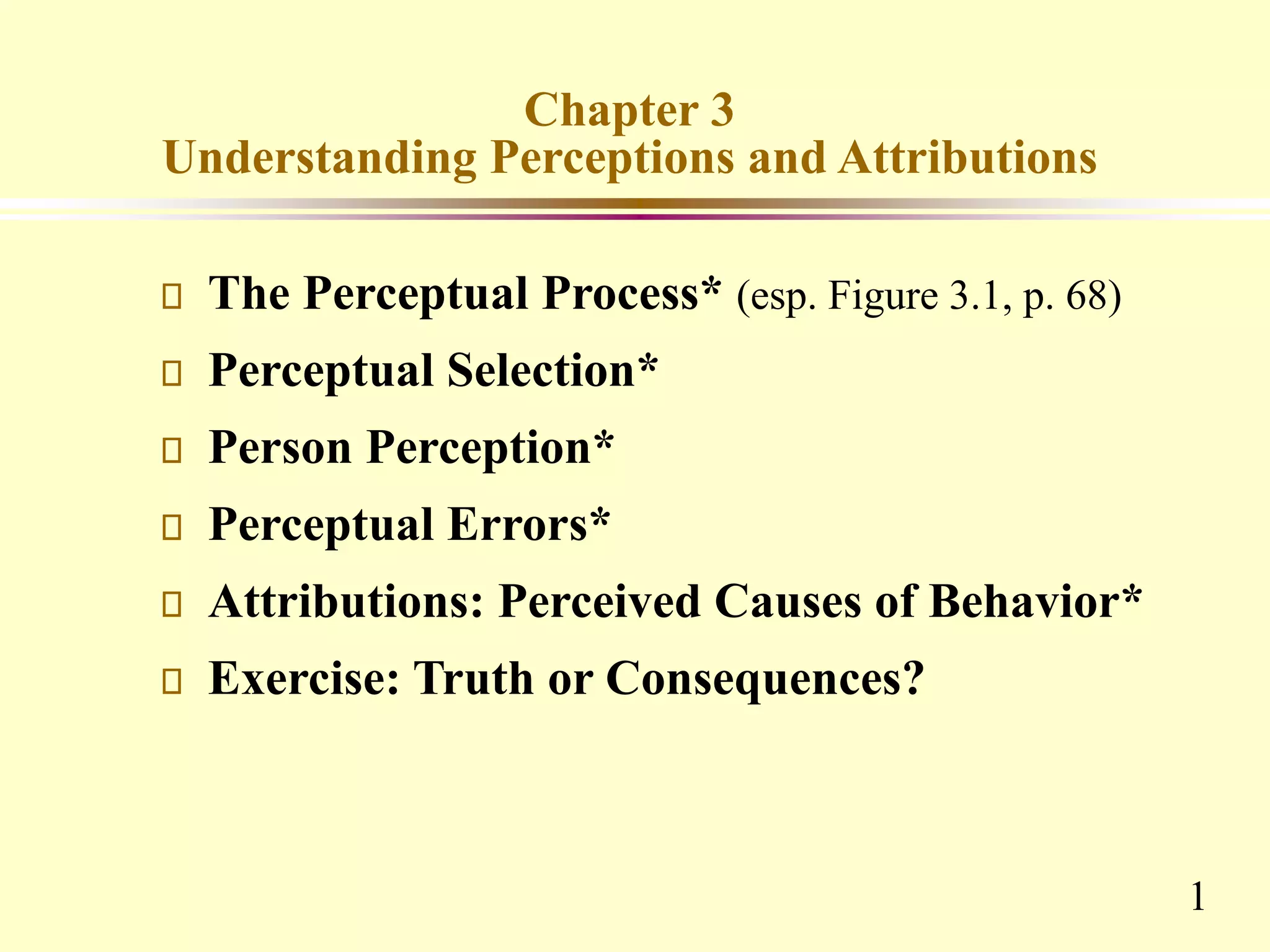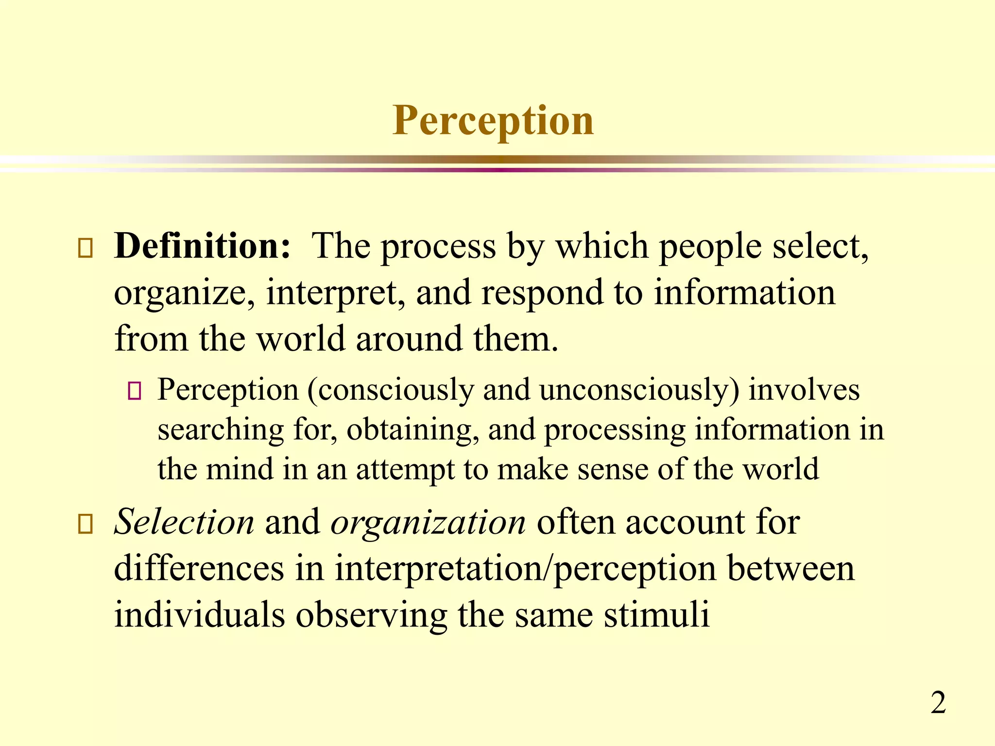 This document provides an overview of key concepts in perception and attribution. It discusses the perceptual process, including environmental stimuli, observation, selection, interpretation, and response. Common perceptual errors are described such as stereotyping, halo effect, and projection. The document also examines person perception and how individuals attribute characteristics to others. It defines the attribution process and how people perceive the causes of behavior as either internal or dispositional versus external or situational. Factors like consistency, distinctiveness, and consensus are reviewed in relation to causal attributions. Frequent errors in attribution like the fundamental attribution error and self-serving bias are also summarized.