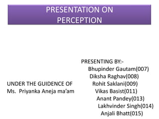 This document outlines a presentation on perception given by several presenters under the guidance of Ms. Priyanka Aneja. The presentation covers the meaning of perception, its significance, and the perceptual process. It discusses how internal and external factors influence perceptual selectivity. It also addresses perceptual organization, interpretation, and the characteristics of the perceiver. The presentation concludes by covering the implications of perception for management and guidelines for improving perception.