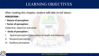 This document provides an overview of perception and different types of perception. It discusses the nature of perception as the interpretation of sensory information and how perception is influenced by both physiological and psychological factors. It defines three main factors that influence perception: subjective perception, which can vary between individuals; objective perception, which relates to formal structures; and social perception, which involves comprehending social cues. The document also examines three main types of perception in more depth: depth perception, distance perception, and temporal perception. It includes pictures to illustrate concepts of depth, distance, and temporal perception. Auditory perception is also briefly discussed.