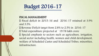 Fiscal deficit was retained at 3.9% in 2015-16 and 3.6% in 2016-17, and is targeted to be 3.2% of GDP in 2017-18 with a commitment to achieve 3% the following year. Total expenditure was projected to be Rs. 19.78 lakh crore in 2016-17 and is estimated to be Rs. 21.47 lakh crore in 2017-18. Revenue deficit targets were reduced from 2.8% to 2.5% in 2016-17 and further to 2.1% in revised estimates for 2017-18, while net market borrowing was restricted to Rs. 3.48 lakh crores after buyback in 2017-18.