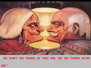 Perception is the process by which individuals organize and interpret their sensory impressions to give meaning to their environment. It is influenced by factors related to the perceiver, perceived object or situation, and the context. Perception involves several stages including sensation, attention, interpretation, and relating to past experiences. Common perceptual biases that can distort perception include stereotypes, halo effects, selective perception, projection, and self-fulfilling prophecies. Managing perceptions and addressing potential distortions is important for effective management.