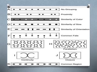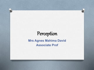 Perception involves the interpretation of sensory stimuli received through the sense organs. Sensation is the initial response to a stimulus, while perception provides meaning to sensations. There are several principles that govern perceptual organization, including figure-ground relationship, closure, grouping, simplicity, contour, context, and contrast. Perception can be influenced by factors like sense organs, brain, memory, interests, needs, and culture. Errors in perception such as illusions and hallucinations can also occur under certain conditions like defective senses, inadequate stimuli, excessive stimuli, poor health, limited attention, or lack of guidance.
