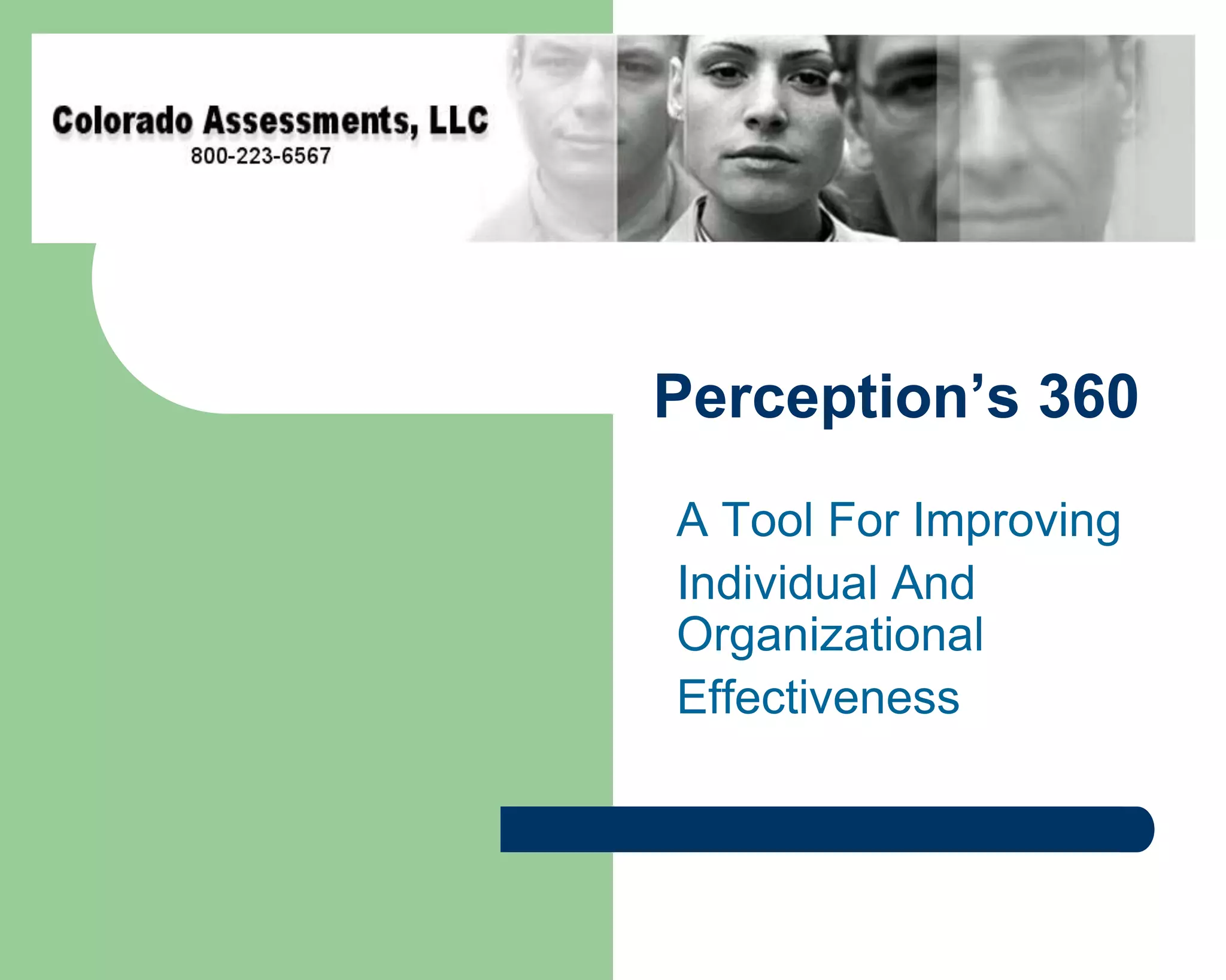 Perceptions 360 provides multi-rater/360 degree feedback surveys to help individuals and organizations improve performance. It surveys a person's boss, coworkers, direct reports and customers to gather feedback on job skills. This identifies strengths and areas for development. When used properly, 360 feedback can be a catalyst for individual and organizational growth. Perceptions 360 offers over 100 ready-to-use surveys in any language and custom survey creation. Reports analyze feedback by rater, competency, strengths and needs to guide improvement. Facilitation aids understanding and acceptance of results to maximize their impact.