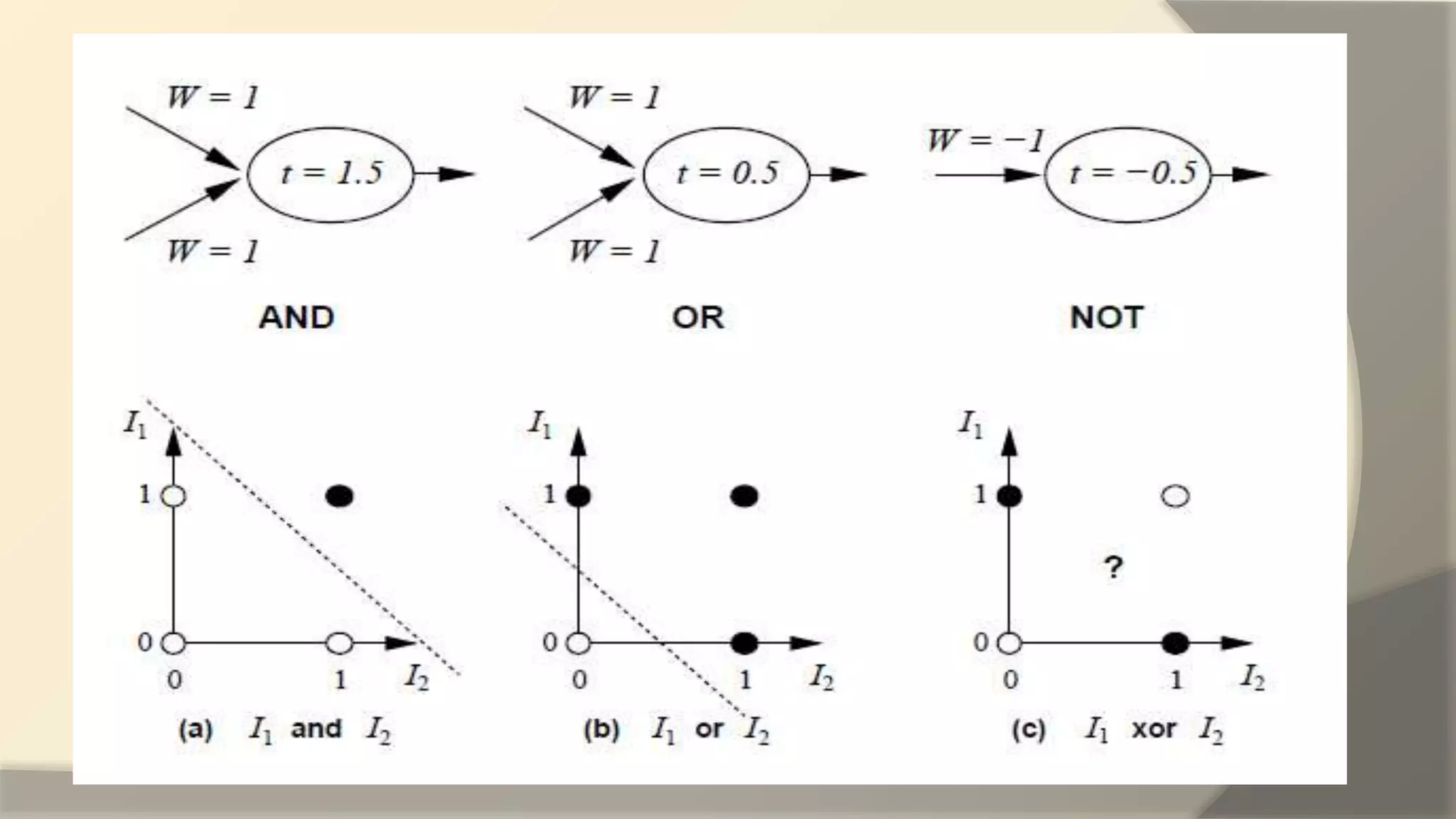 The document discusses the perceptron, a basic artificial neuron model proposed by Rosenblatt in 1958, which classifies inputs into two categories using a step function based on a weighted sum. It highlights the perceptron's limitations, particularly its inability to model non-linearly separable functions, and outlines supervised learning techniques for training it. Additionally, it details the structure and training process of multilayer perceptrons, emphasizing their versatility in handling complex function approximations in machine learning.