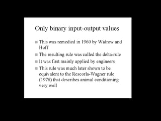 3. Perceptrons are trained using an error-correction learning rule called the delta rule or the least mean squares algorithm. Weights are adjusted to minimize the error between the actual and target outputs.