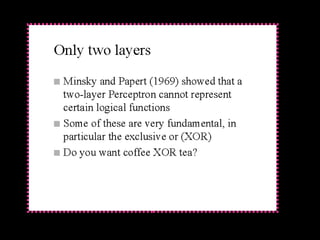 2. Multilayer perceptrons can learn non-linear patterns by using multiple layers of perceptrons with weighted connections between them. They were developed to overcome limitations of single-layer perceptrons.