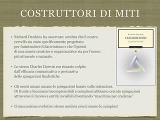 Il documento esplora la complessità della comprensione del darwinismo, sostenendo che l'evoluzione ha influenzato la tendenza umana a cercare spiegazioni finalistiche e a credere in agenti intenzionali, portando alla religione come effetto secondario dei meccanismi cognitivi. Si mette in evidenza la dicotomia tra la scienza e il senso comune, sottolineando come la razionalità possa prevalere sulla credenza. Inoltre, si discute il ruolo delle nostre illusioni e della naturale riluttanza a credere che la complessità della vita possa emergere senza un progetto o intenzione.