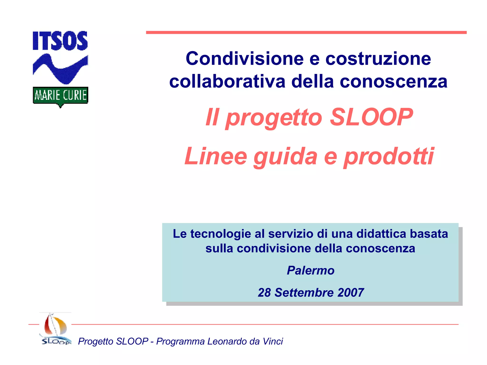 Il progetto SLOOP, all'interno del programma Leonardo da Vinci, promuove l'uso di tecnologie per facilitare l'apprendimento collaborativo e la condivisione della conoscenza attraverso piattaforme online. Questo progetto si basa su contenuti aperti e strategie pedagogiche innovative, mirando a fornire risorse di apprendimento digitali di alta qualità e accessibili in diversi formati e lingue. Sono stati registrati utenti da vari paesi con corsi e attività per studenti e insegnanti, accentuando l'importanza della collaborazione nella formazione.