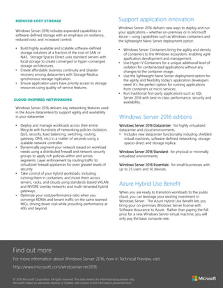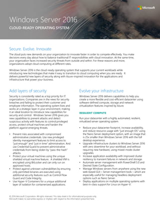 Windows Server 2016 is a cloud-ready operating system that enhances security, innovation, and infrastructure resilience while supporting traditional workloads. It introduces features for privileged access management, shielded virtual machines, and software-defined storage to protect against security threats and reduce costs. The OS supports hybrid cloud environments and application development through its lightweight deployment options and Azure integration.
