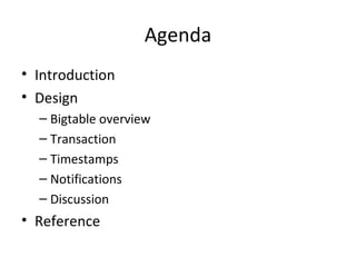 The document discusses the design of Percolator, a system for incrementally processing updates to large datasets. Percolator uses distributed transactions over a random-access Bigtable repository and an observer framework to incrementally update data. Transactions provide ACID semantics using timestamps from a centralized oracle. Observers register functions to be called on data mutations to trigger computation. Percolator was used to reduce the average age of documents in Google search results by 50%.