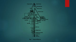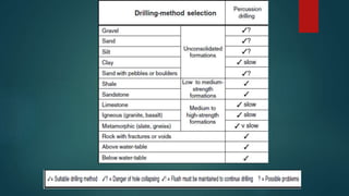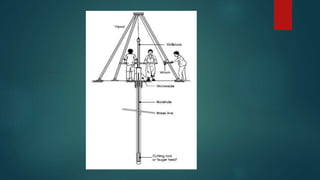 The document discusses various drilling methods used for extracting samples from the ground including percussion drilling, auger drilling, rotary drilling, cable tool drilling, and air core drilling. Percussion drilling involves repeatedly lifting and dropping a heavy bit attached to rope to break up the earth. Auger drilling uses a helical screw that is rotated into the ground to lift cuttings up the borehole. Rotary drilling applies high-speed rotation and downward thrust to drilling rods with a cutting bit to drill through rock and soil. Cable tool drilling also involves repeated lifting and dropping but of a drill stem to force a bit into the ground. Air core drilling uses compressed air to remove cuttings made drilling unconsolidated ground with steel or tungsten