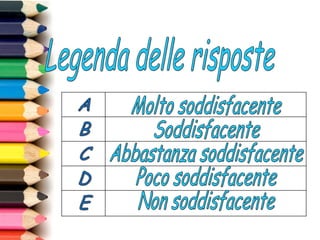 Undici questionari sono stati compilati, con valutazioni che spaziano da 'molto soddisfatto' a 'non soddisfatto'. I risultati evidenziano un'alta soddisfazione complessiva tra i partecipanti. Un partecipante non ha fornito una risposta.