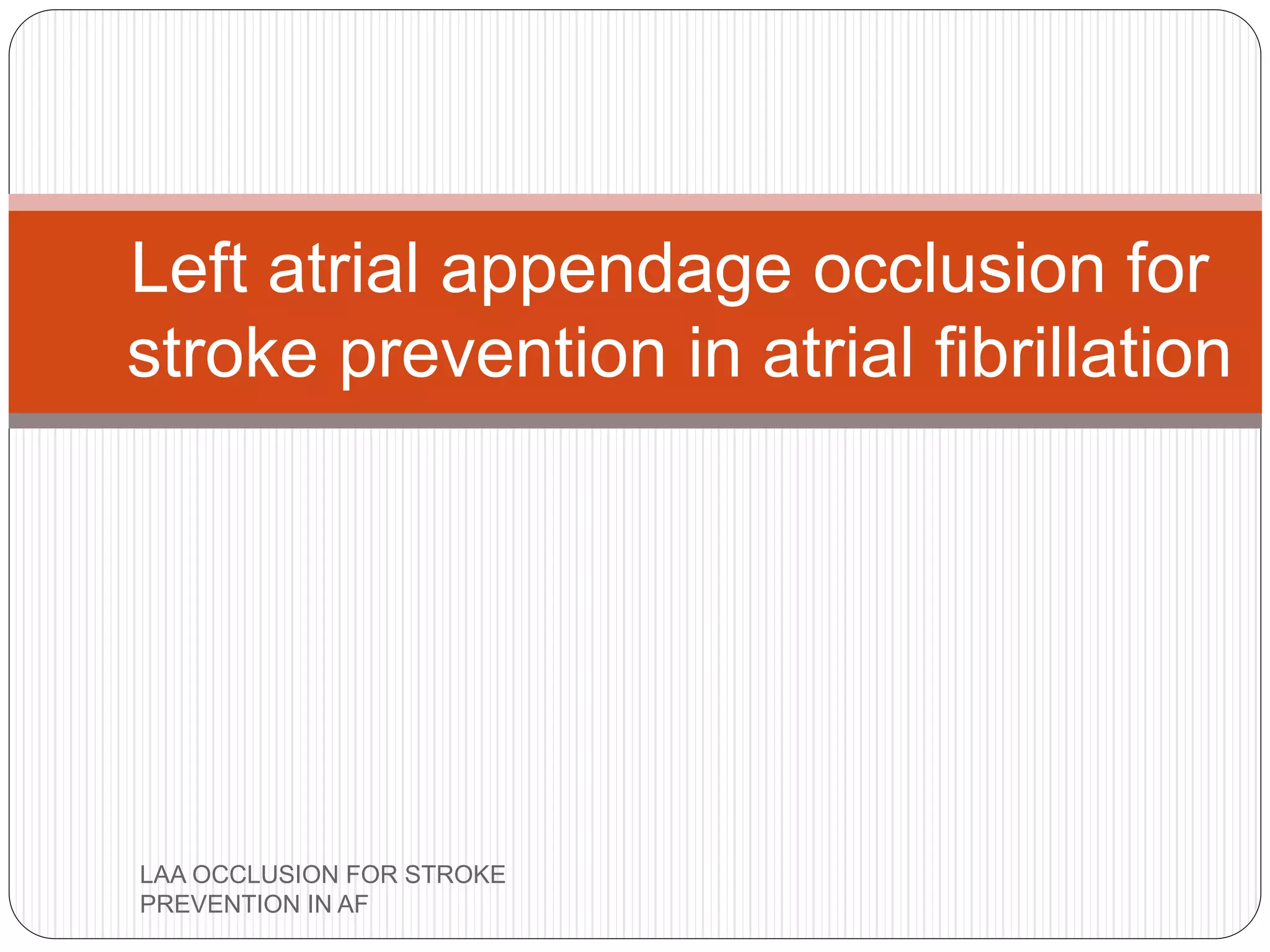 This document discusses left atrial appendage occlusion for stroke prevention in patients with atrial fibrillation. It provides background on atrial fibrillation and the increased risk of stroke. Left atrial appendage occlusion is recommended for patients with a high stroke risk who have contraindications to oral anticoagulation. The document reviews patient selection criteria and contraindications for left atrial appendage occlusion. It also examines left atrial appendage anatomy, imaging techniques for evaluation, and various closure devices including the Watchman, Amplatzer, and Lariat systems.