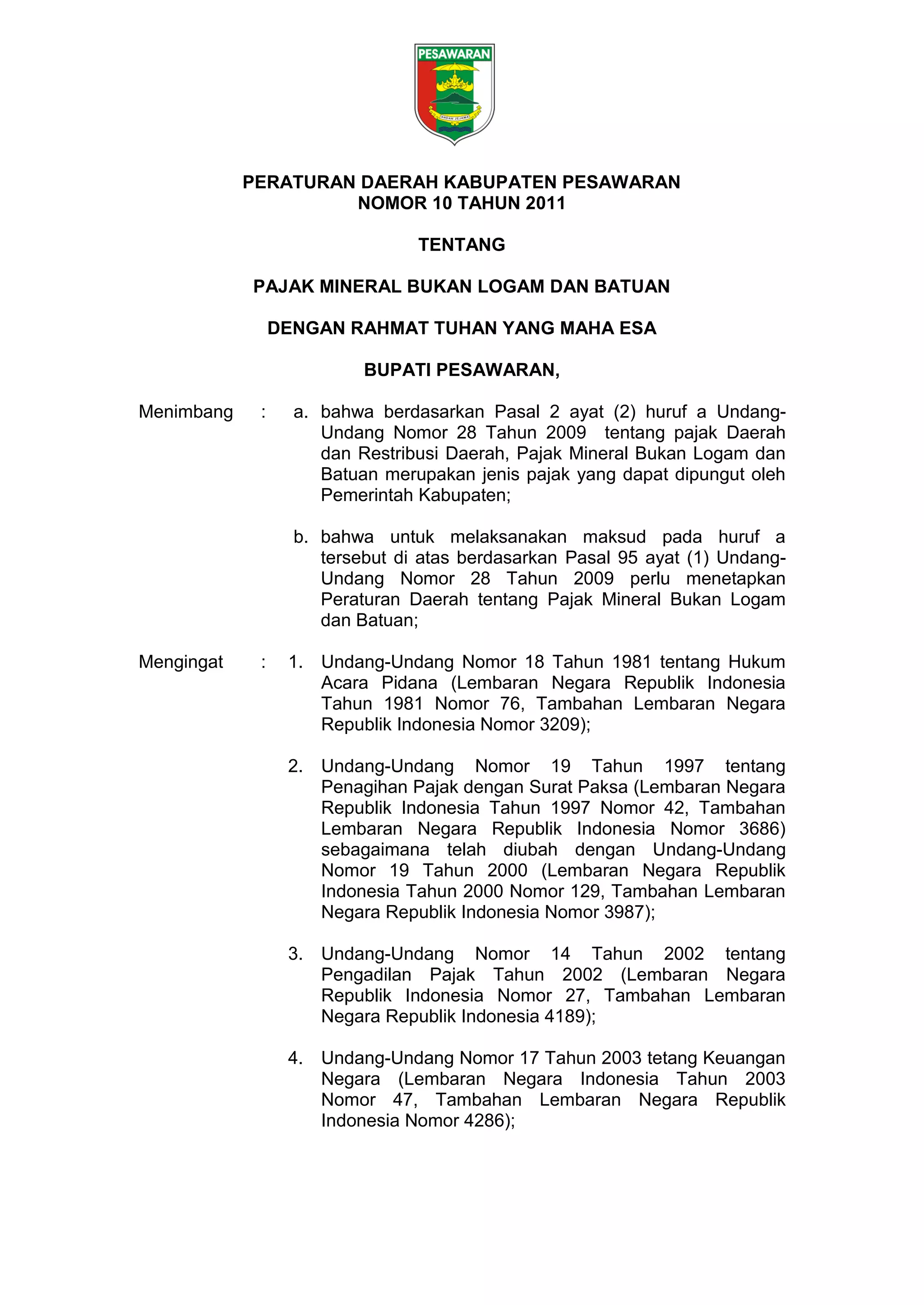 Peraturan Daerah Kabupaten Pesawaran Nomor 10 Tahun 2011 mengatur pajak mineral bukan logam dan batuan, yang merupakan pajak yang dapat dipungut oleh pemerintah kabupaten berdasarkan ketentuan undang-undang. Pajak ini dikenakan atas kegiatan pengambilan mineral bukan logam dan batuan, dengan tarif ditetapkan sebesar 20%. Dokumen ini juga menjelaskan ketentuan umum, objek pajak, tarif, dan prosedur pemungutan pajak dalam konteks hukum yang berlaku.