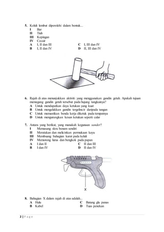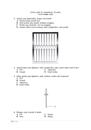 Dokumen ini adalah kertas soalan yang mengandungi 60 soalan berkaitan reka bentuk dan penggunaan bahan dalam projek. Soalan-soalan ini mencakup pelbagai topik seperti jenis bahan, alatan, dan proses yang berkaitan dengan rekaan dan pembangunan projek. Selain itu, juga terdapat soalan yang berkaitan dengan aspek perniagaan dan pengurusan kewangan.