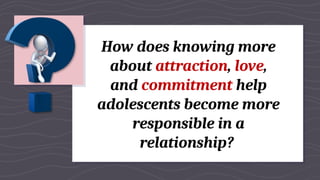 The document discusses the importance of understanding attraction, love, and commitment in adolescent relationships, highlighting acceptable expressions of feelings and the necessity of self-love. It emphasizes communication, forgiveness, and the need to navigate challenges consciously to maintain healthy relationships. Additionally, it addresses the risks associated with abusive relationships and the responsibilities involved in sexual activity, advocating for open conversations with parents and self-awareness in decision-making.