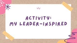 The document outlines the various roles and characteristics of effective leaders in society, emphasizing the importance of servant leadership, responsibility, and effective communication. It highlights the influence leaders can have on followers through setting examples, showing empathy, and fostering motivation. Additionally, it discusses the critical attributes of leaders, such as active listening, initiative, enthusiasm, and the ability to appreciate team members.