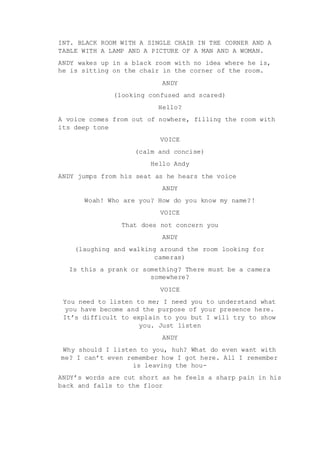 Andy wakes up in a dark room where a disembodied voice tells him it has been watching him and knows about his past misdeeds, like mistreating tenants and neglecting his mother. The voice subjects Andy to pain to make him remember and feel remorse. It shows Andy visions of his poor past behavior. Andy sees a picture of his wife Mary, which brings him calm. The voice says Andy's time is up due to a car accident. It gives Andy a chance to see how his death impacts others. Andy watches as his grieving wife Mary cries over his body. The voice tells Andy that Mary truly loved him despite his flaws. Andy now understands the error of his ways.