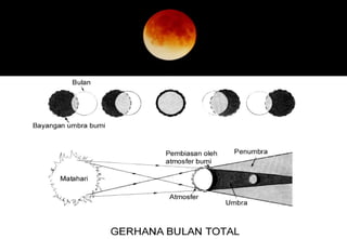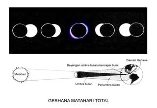 Dokumen ini menjelaskan fenomena peredaran benda langit dan gerak rotasi serta revolusi Bumi, termasuk gerak harian matahari dan bulan, serta fase-fase bulan. Dikenalkan juga informasi mengenai gerhana yang terjadi di wilayah Indonesia dan karakteristik orbit bulan. Data yang disajikan meliputi periode waktu, lokasi, dan pergeseran posisi titik-titik astronomis.