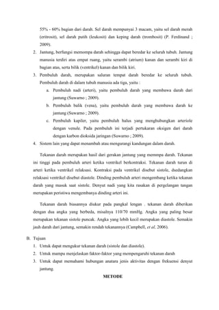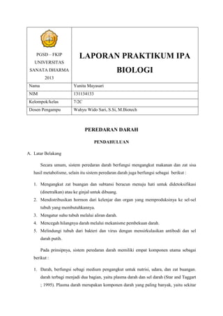 Dokumen ini adalah laporan praktikum biologi tentang sistem peredaran darah, mencakup fungsi, komponen utama, dan cara pengukuran tekanan darah serta frekuensi denyut jantung. Penelitian dilakukan dengan pengukuran tekanan darah dan denyut nadi pada individu berbeda, menunjukkan variasi dipengaruhi oleh faktor usia, aktivitas fisik, dan kondisi kesehatan. Hasilnya mengindikasikan hubungan antara aktivitas fisik dan perubahan denyut jantung serta tekanan darah.