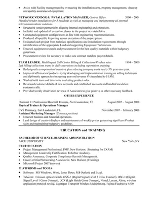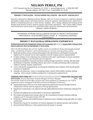 Nelson Perez is an innovative Project Manager with over 16 years of experience managing complex telecommunications projects. He has managed multi-million dollar projects for EchoStar Satellite Communications and Verizon. Perez is bilingual in English and Spanish and has a Bachelor's degree in Business Administration. He is currently preparing to take the Project Management Professional certification exam.