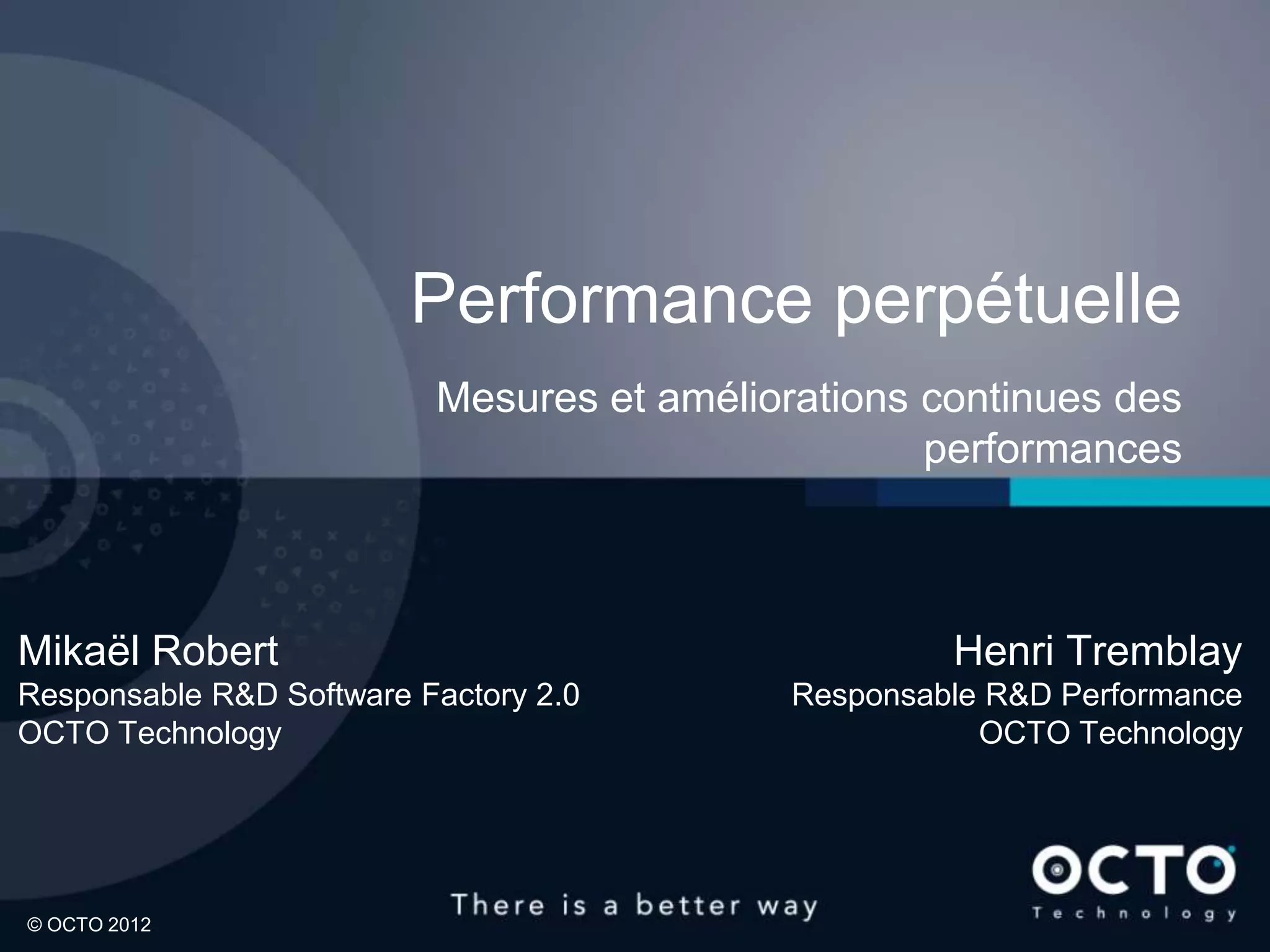 The document discusses continuous performance measurement and improvement. It emphasizes measuring code performance, optimizing only where important, and conducting continuous load testing in production. Performance is a concern throughout the entire development lifecycle, from architecture to production. Automated tests are used to assert that response times meet thresholds.