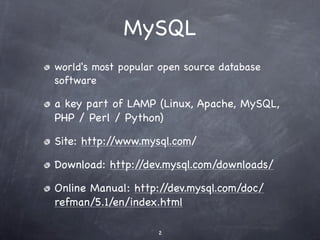 The document provides an overview of how to summarize and interpret information from MySQL server status and variable outputs to understand server performance and optimize configuration. It explains that status variables show current server activity levels, while global and session variables display configuration settings. Comparing status outputs over time calculates rates like queries/second. Key metrics help identify bottlenecks like a small key buffer size if the key read cache miss rate is high.