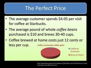 The document discusses coffee consumption and costs. It provides details on how much the average American consumes per year (8.8 lbs), how much the average Starbucks visit costs ($4.05), and how much cheaper it is to brew coffee at home (12 cents per cup). Instructions are given for making espresso and lattes at home using an espresso machine that typically costs between $150-400.
