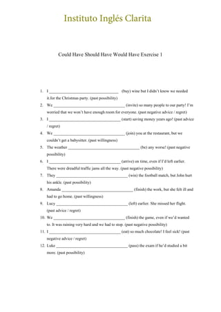 The document contains 25 sentences using modal verbs to express regrets or wishes about past possibilities, willingness, advice, or negative possibilities. The sentences refer to situations where people wish they had done something differently in the past such as buying wine for a party, inviting fewer people, starting to save money earlier, finishing a game despite the rain, and bringing a coat to avoid feeling cold.