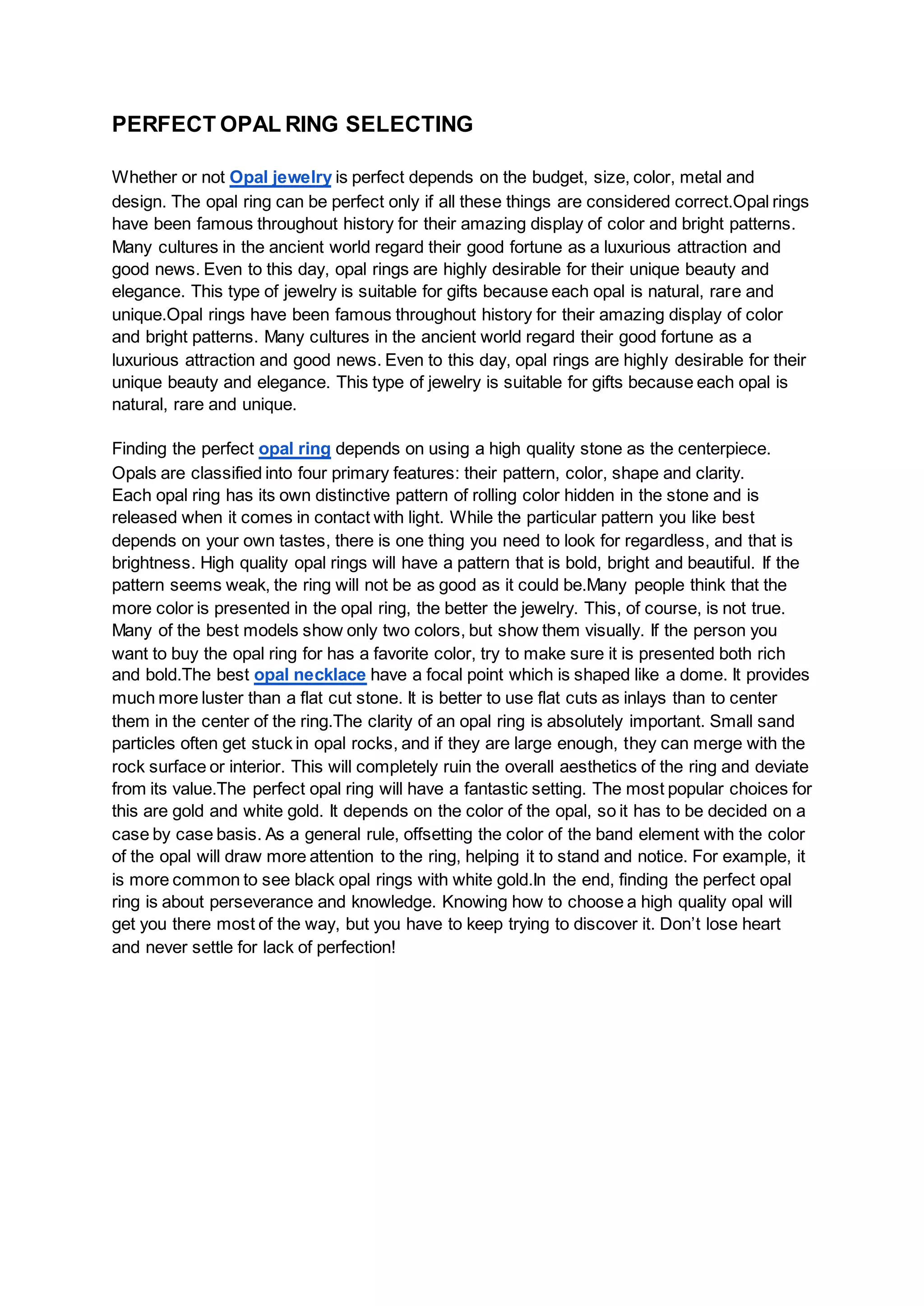 Finding the perfect opal ring requires considering several factors, including the quality of the opal stone, its pattern, color, shape, and clarity. A high quality opal ring will have a bold, bright pattern visible when light hits the stone. The dome shape of the opal provides more luster than a flat cut. Small particles can ruin the aesthetics if the clarity is poor. The perfect setting depends on offsetting the metal band against the opal color to draw attention to the stone. Discovering the perfect opal ring takes perseverance and knowledge in selecting a high quality stone.