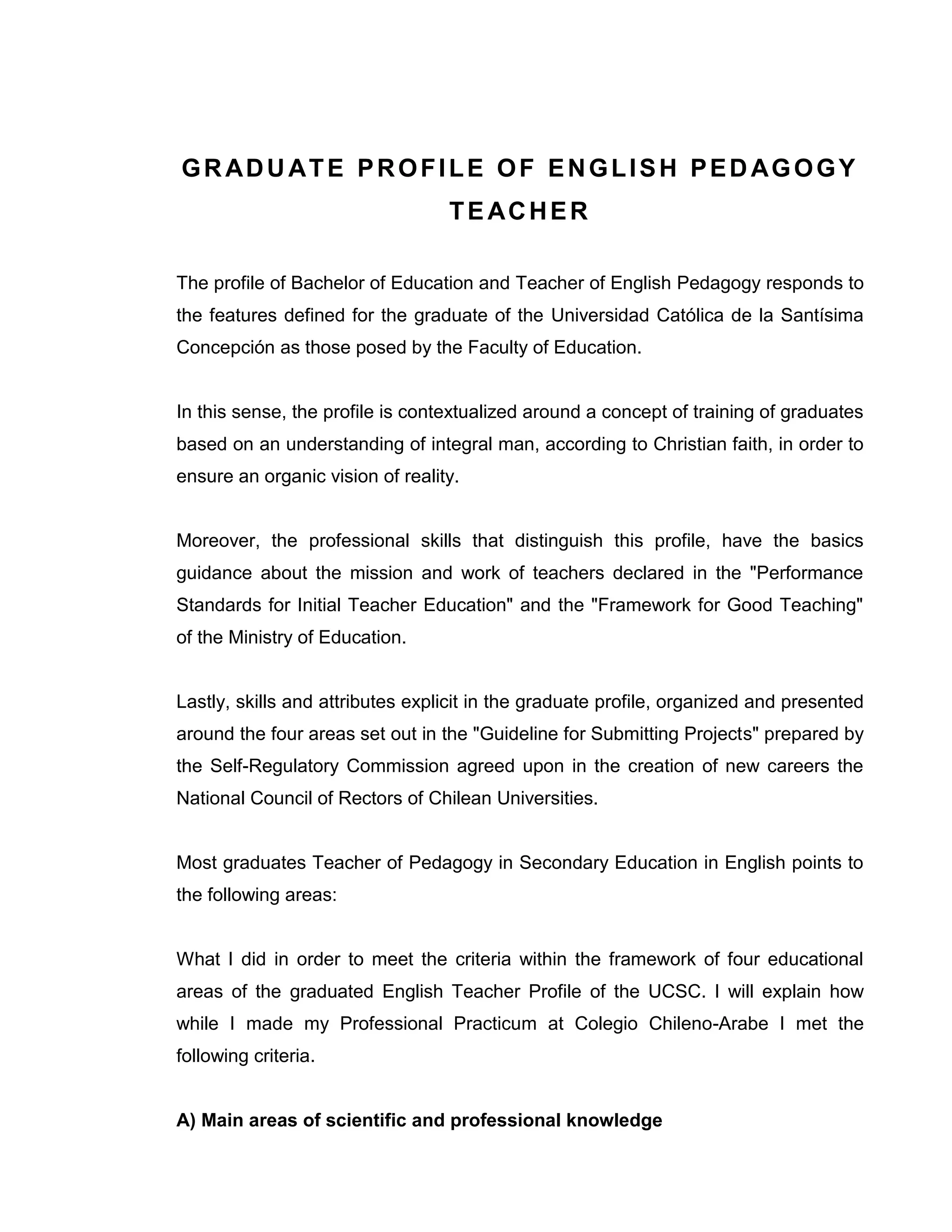 The document provides details about the graduate profile of a Bachelor of Education in English Pedagogy from the Universidad Católica de la Santísima Concepción in Chile. It outlines the key areas that graduates should demonstrate competency in, including: general scientific and professional knowledge of teaching practices and theories; general skills like critical thinking and problem solving; specialized skills in education and English language teaching methods; and attitudinal and ethical values of respect, diversity, and democratic participation. The profile is meant to ensure graduates have an integrated vision of education grounded in Christian faith and are prepared to perform the roles and responsibilities of teachers according to Chilean and international standards.
