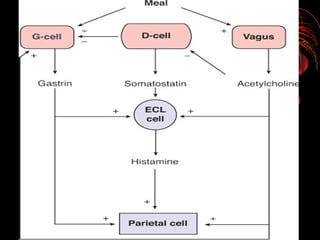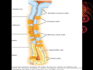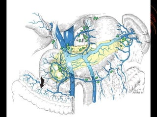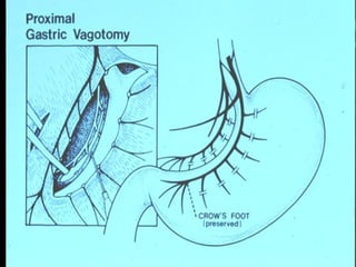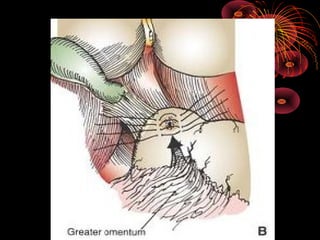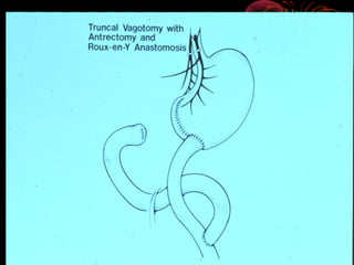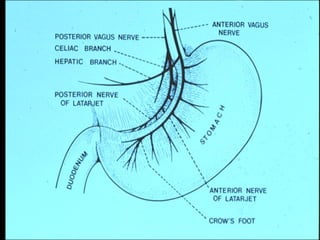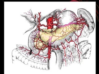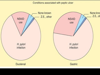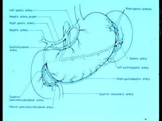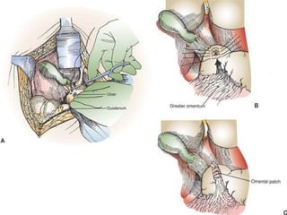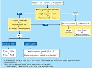 This document discusses perforated peptic ulcers. It first covers the surgical anatomy and blood supply of the stomach and duodenum. It then discusses the epidemiology, pathophysiology, risk factors, presentation, diagnosis, and treatment of perforated peptic ulcers. Key points include that perforations are more common in duodenal versus gastric ulcers and have a higher mortality rate for gastric ulcers. Risk factors include H. pylori infection, NSAID use, smoking, and Zollinger-Ellison syndrome. Patients typically present with sudden severe abdominal pain. Diagnosis involves upright chest x-rays showing free air. Treatment is surgical repair of the perforation.