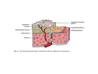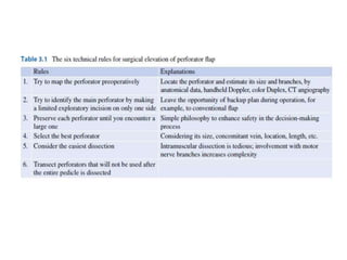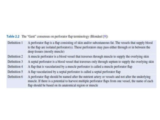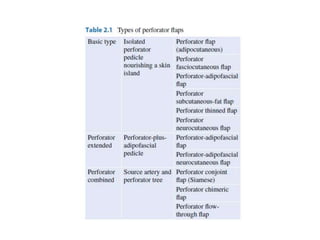 - Advantages over traditional flaps include reduced donor site morbidity and more tailored reconstruction to match defects. Various types of perforator flaps have been developed like propeller flaps.