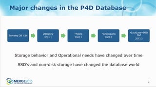 The document discusses updates and operational changes in the p4d database, including advances in storage technology like SSDs and the impact of various database management practices. Key topics covered include the importance of file system caching, the nuances of database reorganization, and performance monitoring techniques. The document also contrasts the specific functionalities of p4d as a specialized database management system against general-purpose DBMS options.