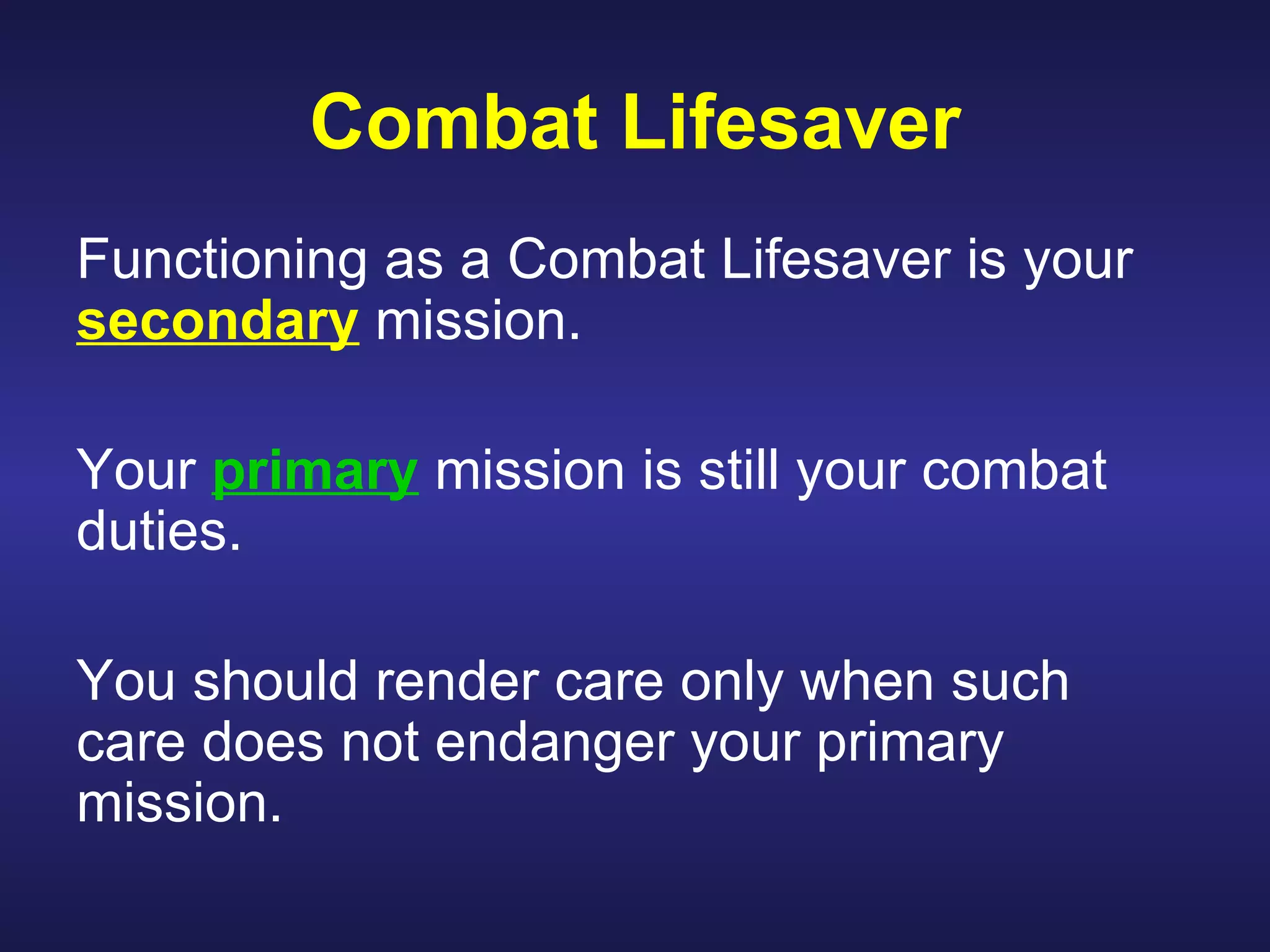 Over 2500 soldiers died in the Vietnam conflict due to blood loss from wounds to the arms and legs despite having no other serious injuries. As a combat lifesaver, one's primary mission is combat duties, but rendering medical care is secondary when it does not jeopardize the primary mission. For care under fire, if a casualty can return fire or move to safety, direct them to do so or tell them to play dead if unable; do not attempt CPR for casualties without signs of life. Prompt use of tourniquets in this phase may save lives since hemorrhaging from extremities is a leading cause of preventable combat death.