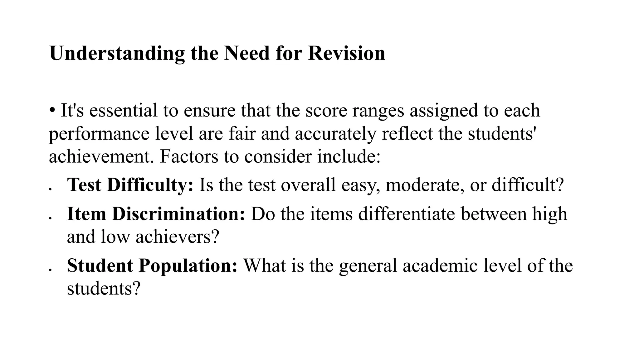The document outlines the importance of revising performance descriptors to ensure fair scoring that reflects student achievements, considering factors such as test difficulty and item discrimination. It proposes methods for revising score ranges, including item analysis, standard deviation, a norm-referenced approach, and expert judgment. Each method provides a structured way to assess and adjust score ranges to improve assessment accuracy.