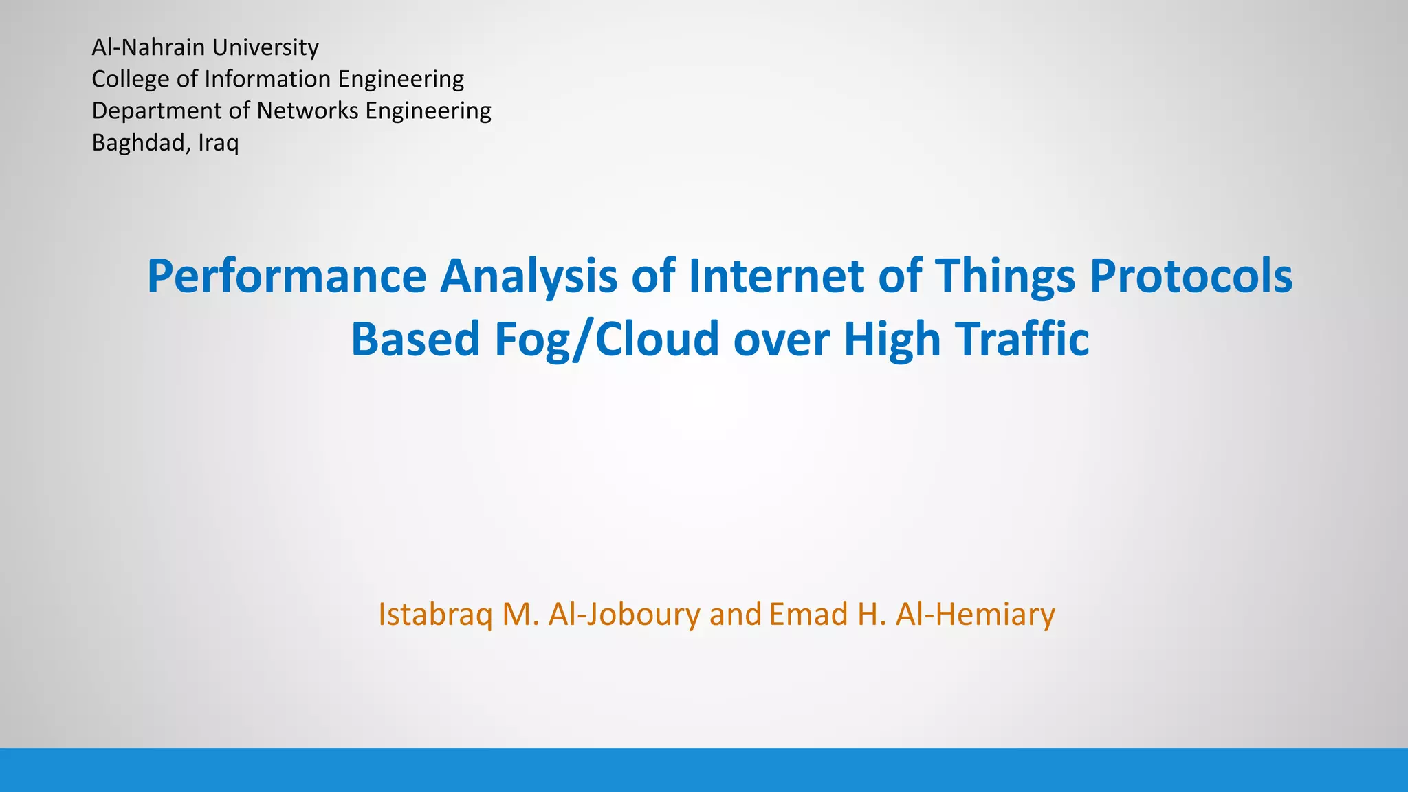 The document analyzes the performance of Internet of Things (IoT) protocols like MQTT and HTTP when used with fog and cloud computing over high traffic networks. The research tests response time, throughput, and packet loss for different IoT protocols (MQTT with QoS 0 and 1) and transmission methods (fog vs cloud) using realistic IoT sensors and traffic loads. The results showed MQTT generally had lower response times and higher throughput than HTTP, especially when using fog computing rather than cloud. MQTT QoS 1 also outperformed QoS 0 in most tests. Overall, fog computing with MQTT QoS 1 was found to have the best performance for high traffic IoT applications.